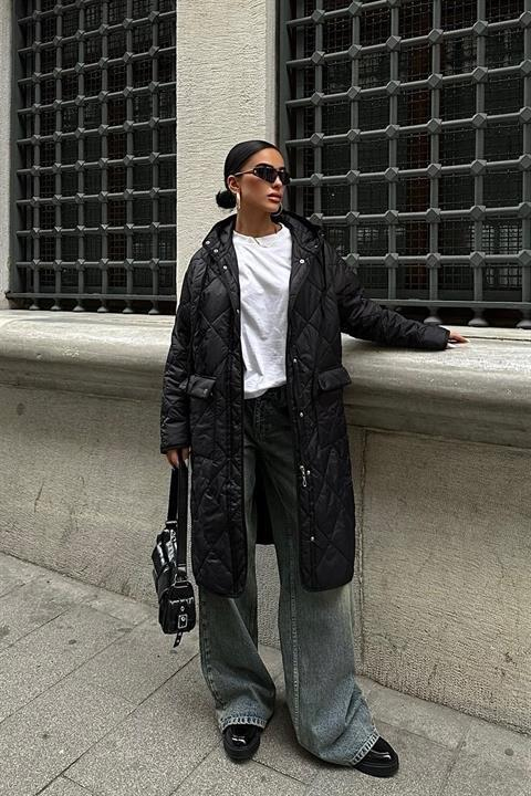 Fermuar Ve Kapşonlu Uzun Kapitone Mont 7062