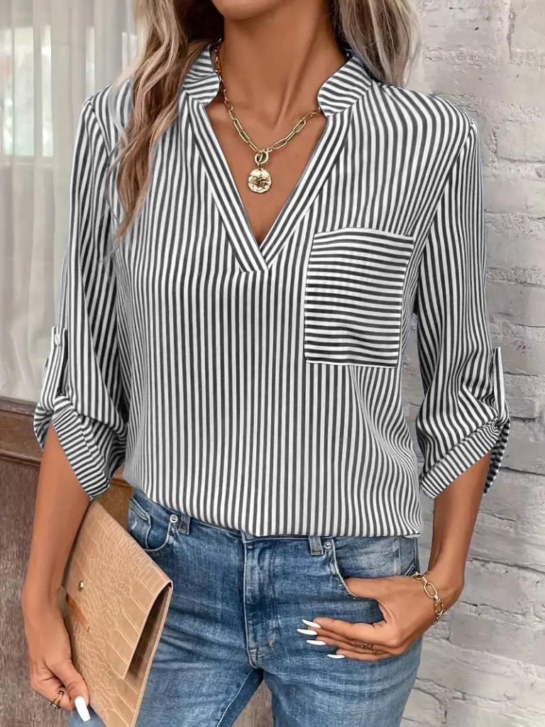Kadın Uzun Kollu V Yakalı Cepli Dokuma Gömlek