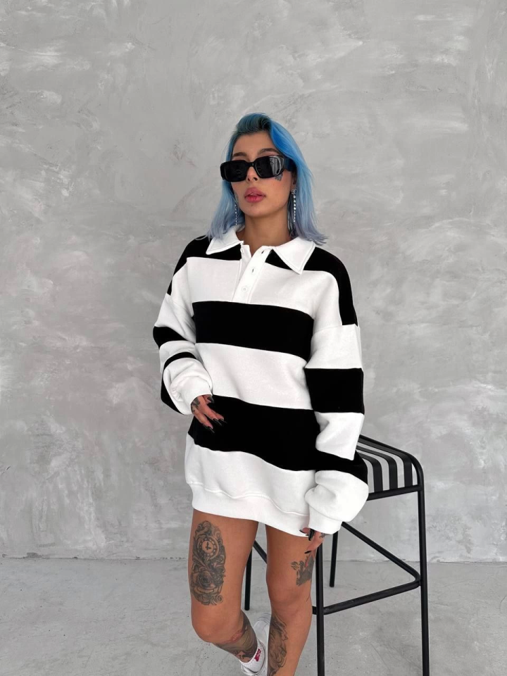 Unisex Üç İplik Parçalı Yakalı SweatShirt - Siyah