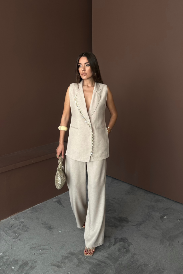 YAKA MİDYE KABUĞU SIRALI YELEK - PANTOLONTAKIM KETEN KUMAŞ - Ham